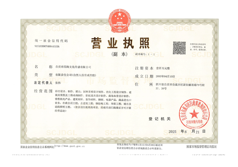 自贡市四海文化传播有限公司创立于2003年,是一家以灯会、彩灯文化为核心,深度融合传统技艺与现代科技的新派文化传播企业。公司立足“中国灯城”自贡,历经二十余年发展,已成长为集彩灯文化传播、IP设计与引进、立体光影沉浸式场景搭建、文创灯光解决方案、灯展活动策划及主题展演嘉年华运营于一体的灯会公司,彩灯公司。四海文化以“用光影讲述文化故事”为使命,致力于通过创新表达激活传统文化基因,让自贡灯会这一国家级非物质文化遗产焕发时代生命力。